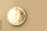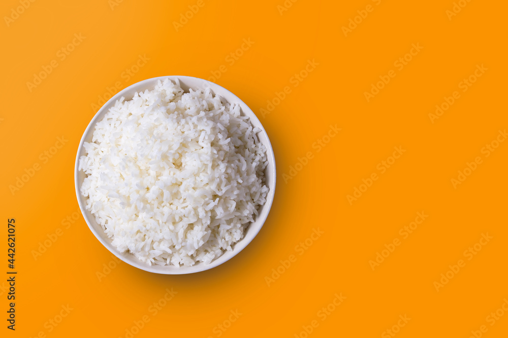 The rice was cooked in a white dish laying on an orange background with light coming in from the side, slightly shadowing. view from above ,Thai food