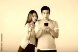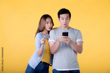 Excited Asian couple holding credit card and smartphone feeling excited while looking at a mobile phone isolated on colour background