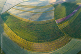 Aerial shot, countryside landscape during summer or spring time. Fields and meadows in Moravia, Czech republic.