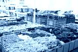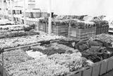 Red, orange, yellow, pink roses and other flowers in plastic boxes transport and storage for sale in flower shops.