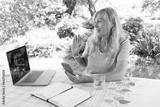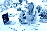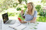 Smiling mature woman having video call via computer in the home office. Online team meeting video conference calling from home. Attractive Businesswoman Telework. Business video conferencing.