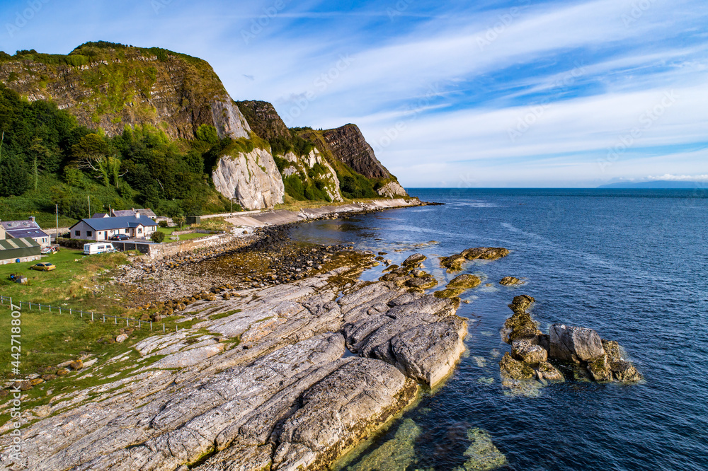 Northern Ireland, UK. Atlantic coast with cliffs, Causeway Coastal Route, houses, camping and geological formation of rocks at Garron Point. Aerial view at sunrise