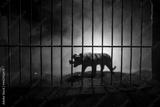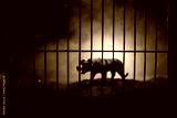 Silhouette of a tiger miniature standing in a zoo cage dreams of freedom. Creative decoration with colorful backlight with fog.