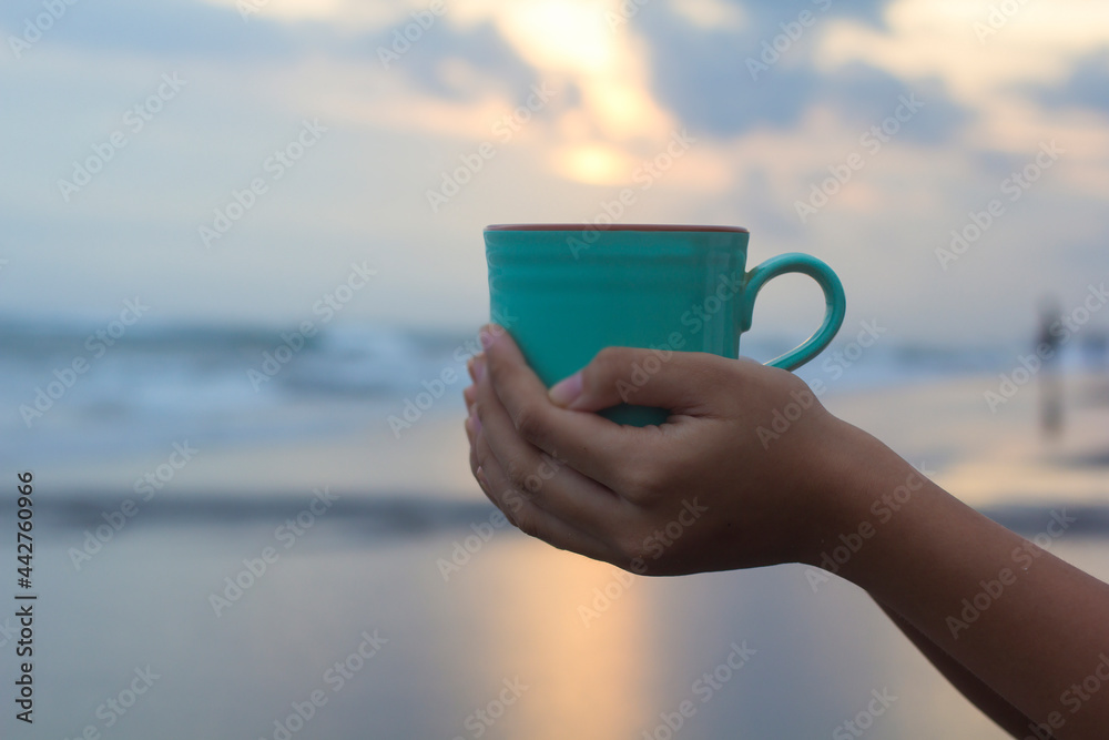 Person holding a cup of coffee in hand on beach background at sunset. Self love and care concept. Relax weekend.