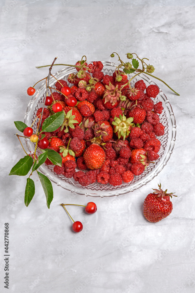 A plate with fresh berries on a marble surface