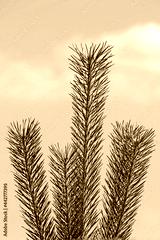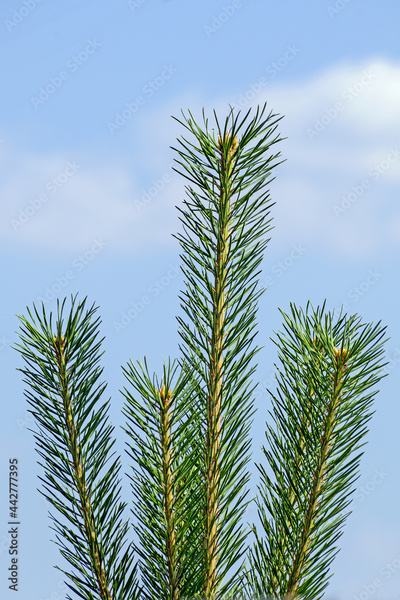 The top of a young pine tree in the rays of the summer sun