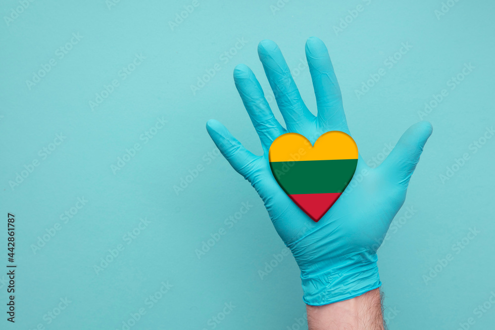 Lithuania medical health heart. Nurse hand holding country heart flag