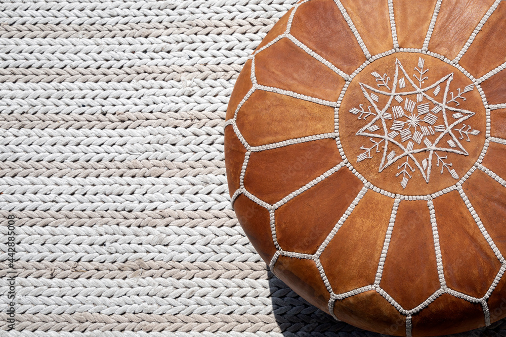 Boho style brown leather pouffe (ottoman) on a beige rug, copy space