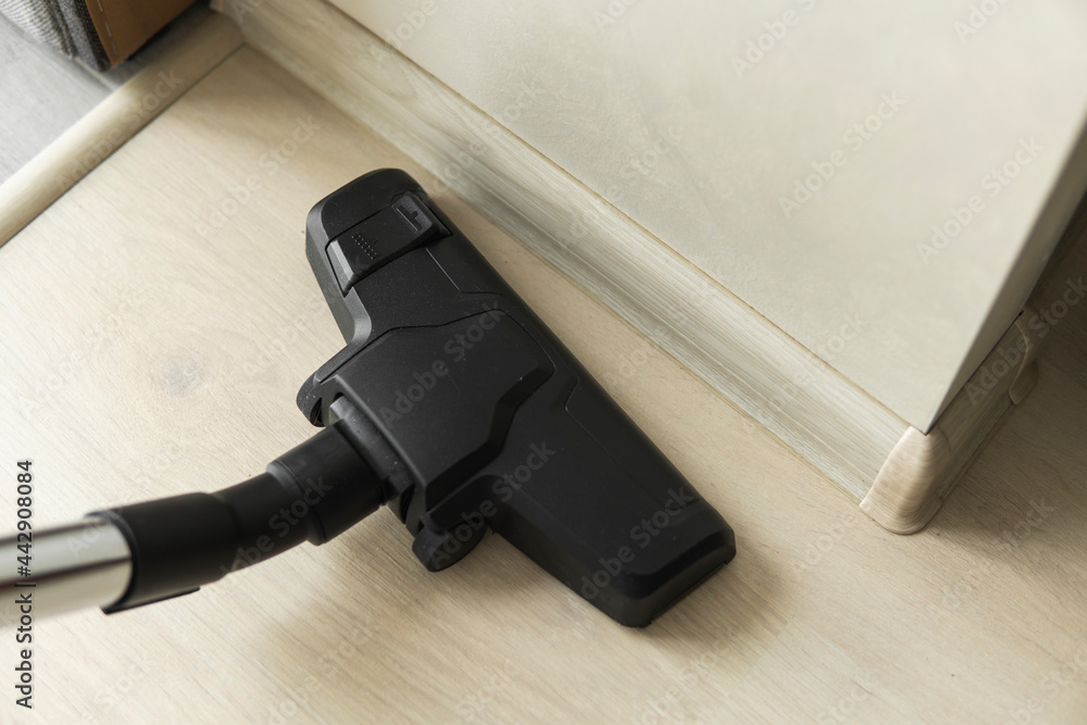 Top view of head of modern vacuum cleaner cleaning a laminate.