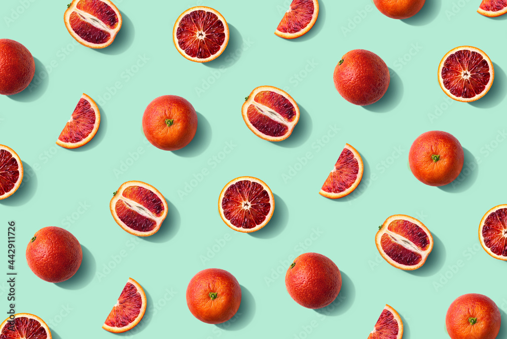 Colorful fruit pattern of fresh whole and sliced blood orange