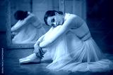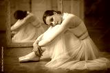 Portrait of beautiful ballerina near mirror. Image with selective focus, noise effect and toning
