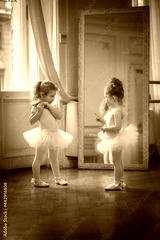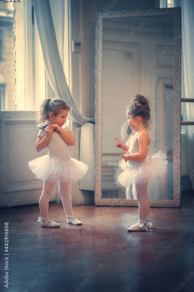 Funny little ballerinas is eating chocolate in the ballet class and the other one is looking at her. Image with selective focus, toning and noise effects.