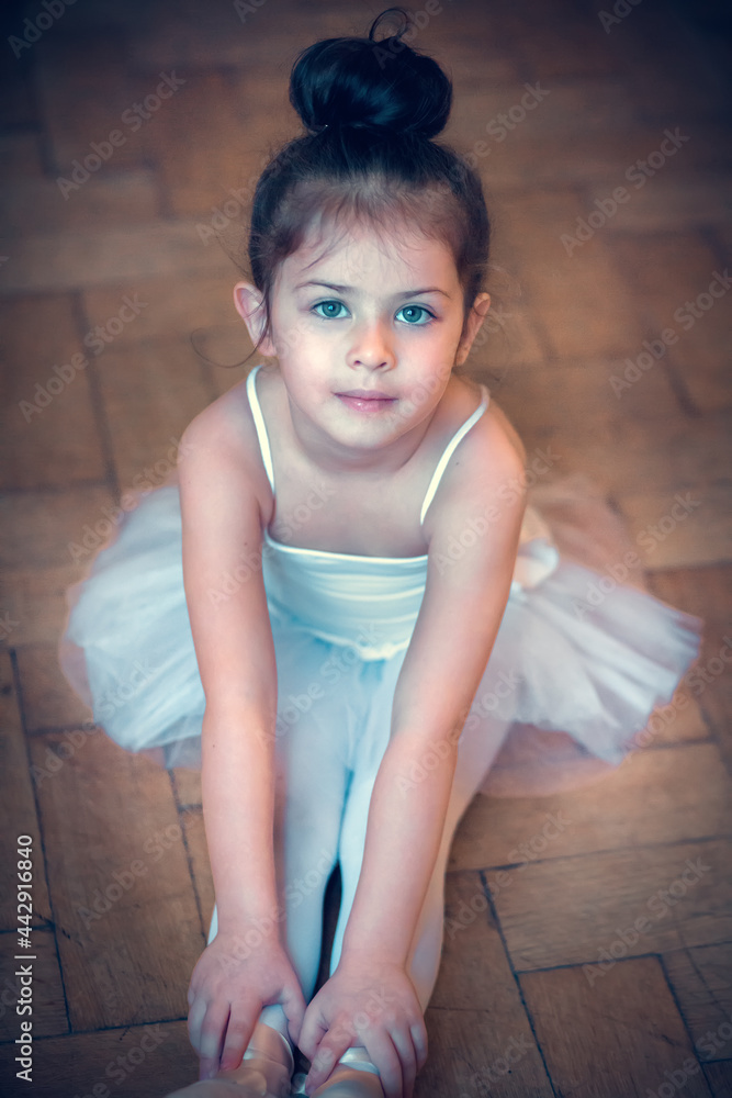 Funny little ballerina in tutu. Image with selective focus, toning and noise effect.