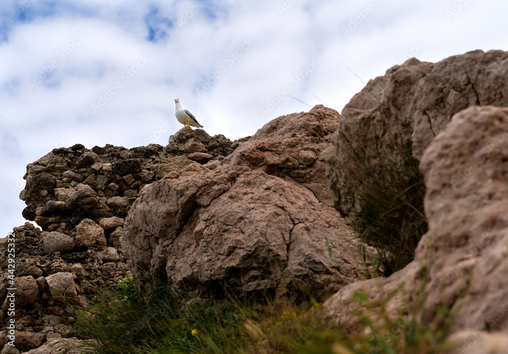 Seagull standing on the top of the cliff. Beautiful backdrop for your design. Wildlife concept.