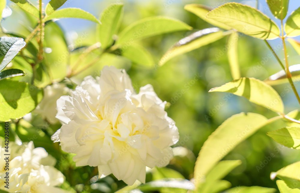 Close up blossoming white rose flowers on defocused natural leaves backdrop. Selective focus.