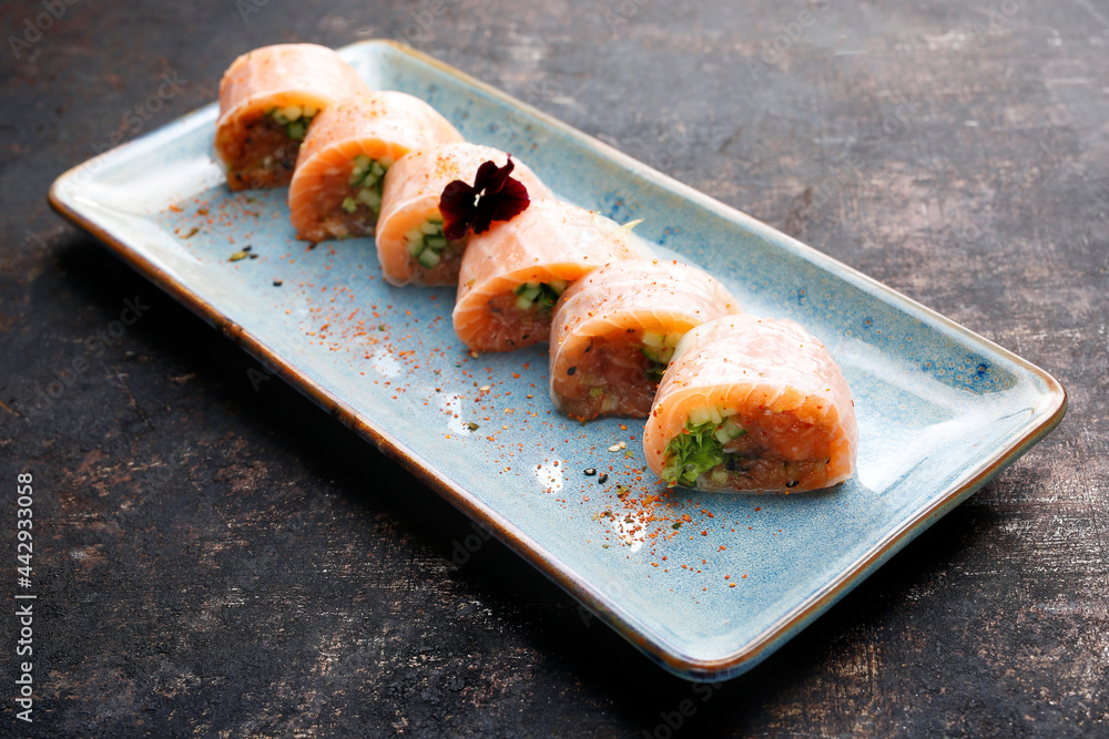 A composition of 6 piece maki set with salmon, cucumber, in rice paper, garnished with edible flower, on an oriental tray, plate, on black stony background. Sushi fit roll. Japanese cuisine delicacy.