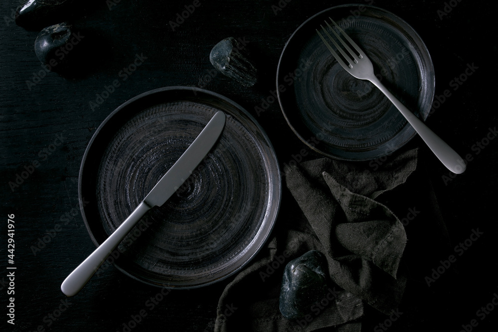 Empty black ceramic plates with black stones
