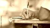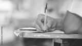 Students writing and reading exam answer sheets exercises in classroom of school with stress