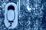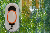 Vacuum robot washes a dirty window. Modern glass and window cleaner. The concept of cleaning and polishing windows