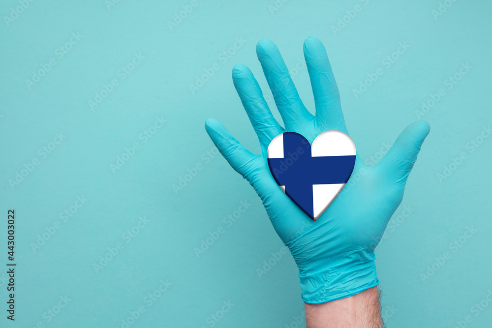 Finland medical health heart. Nurse hand holding country heart flag