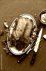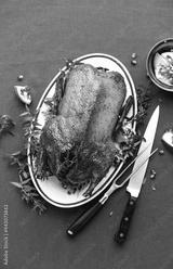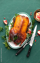 Roasted goose with caramelized crust, served with pomegranate, top view