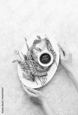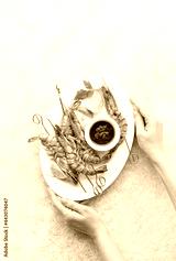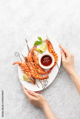 Prawn grilled skewers with hot spicy sauce, top-down view