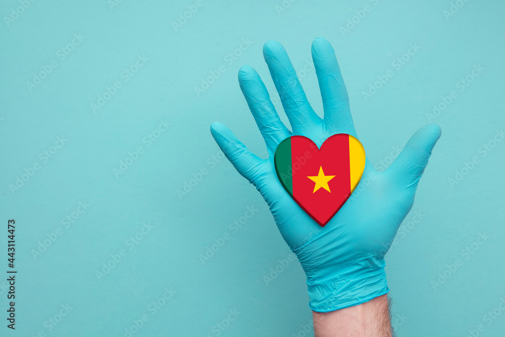 Cameroon medical health heart. Nurse hand holding country heart flag