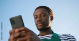 Low angle view of the optimistic multiracial farmer scientist in apron using smartphone mobile technology application while working at the field and smiling. Agriculture concept