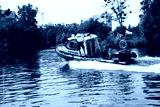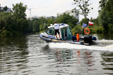 Motorówka policyjna alarmowo, szybko płynie po rzece.