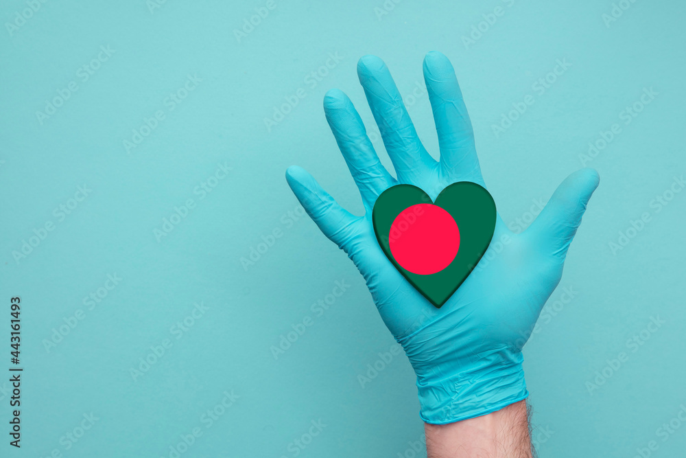 Bangladesh medical health heart. Nurse hand holding country heart flag