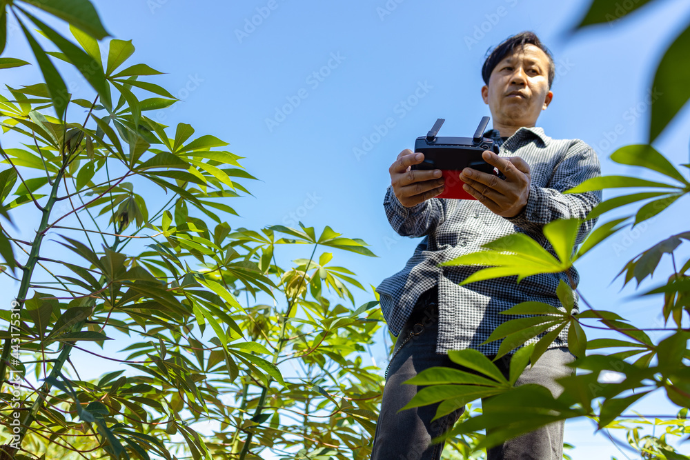 An Asian farmer uses agricultural drones to detect damage and growth of the crops he grows on his farm.