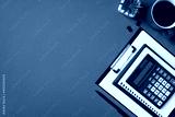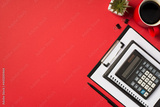 Top view photo of cup of drink plant two binder clips pen black clipboard folder two planners and calculator on isolated vivid red background with empty space