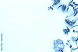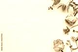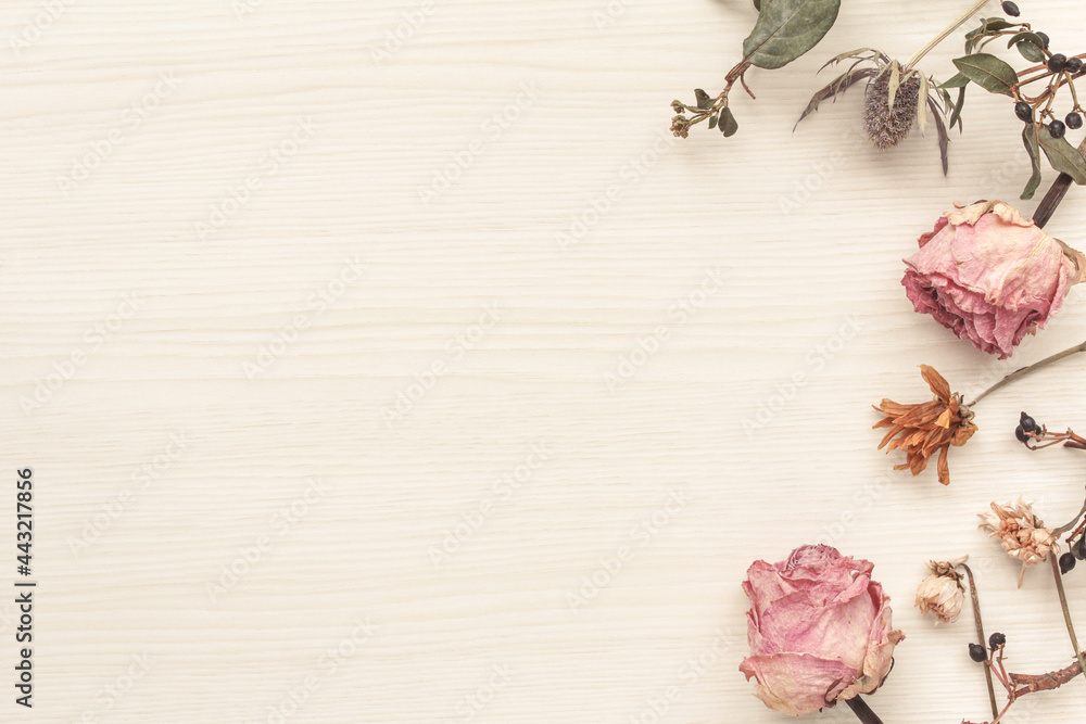 白っぽい木目の背景とバラなどのドライフラワーの飾り
