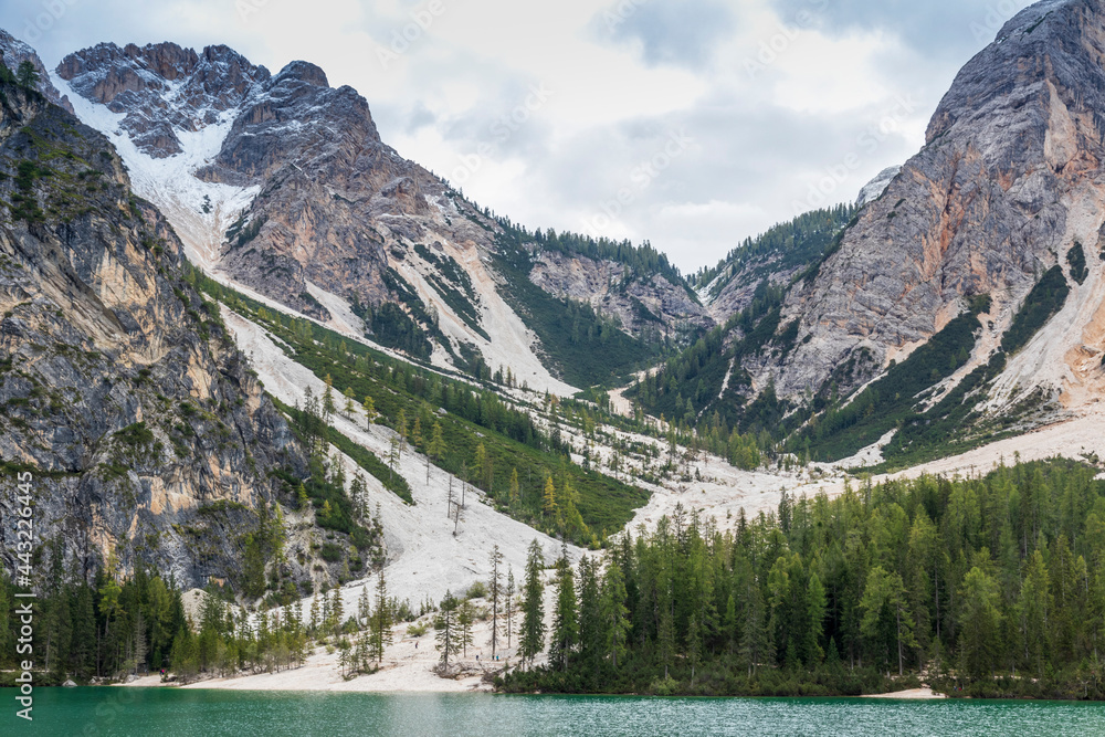 Landscape at Lake Braies. Lago di Braies. In Italian dolomiti alps.