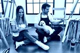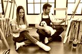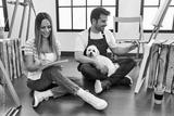 Two hispanic students smiling happy painting at art studio. Sitting on the floor with dog.