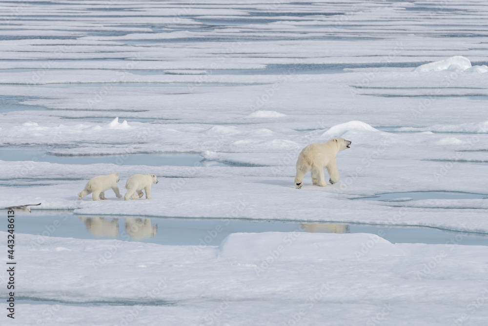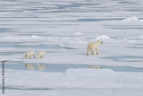 Wild polar bear (Ursus maritimus) mother and cub on the pack ice