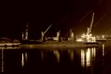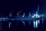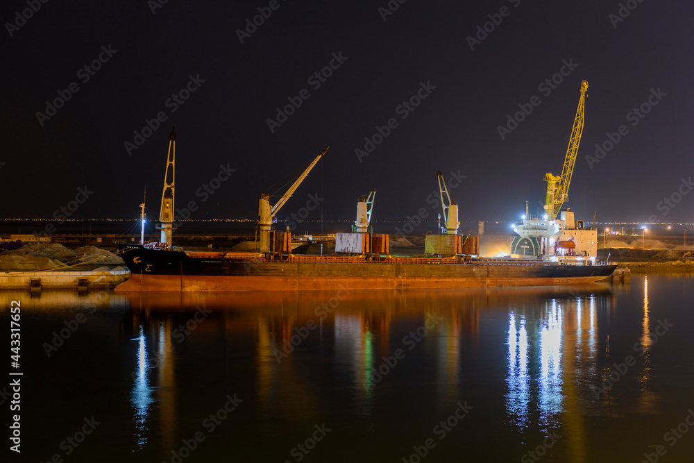 Bulk carrier vessel moored alongside berth in port. Night view. Bulker. Dry cargo ship.