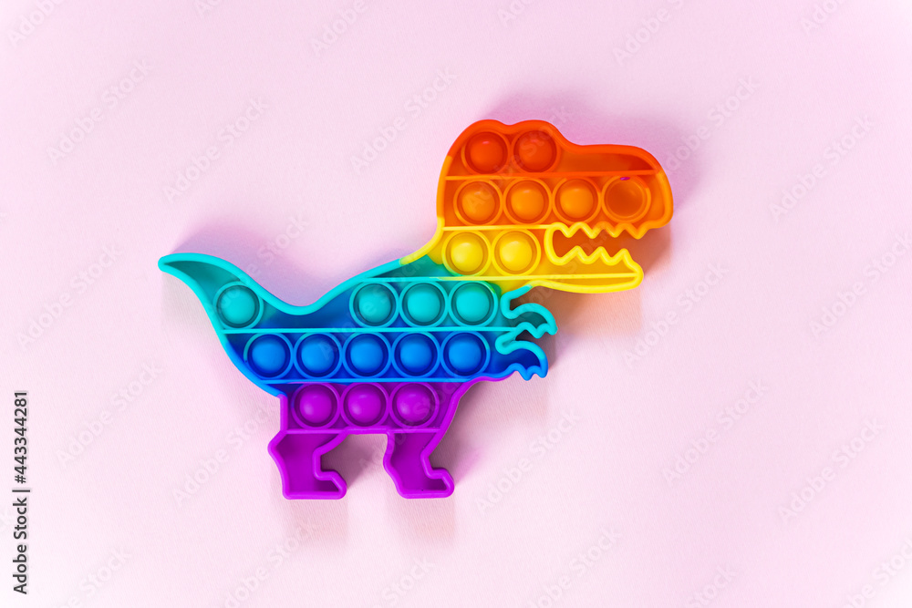 Popit rainbow toy in rainbow colours and dino shape. Trendy bubble pop fidget. Funny anti stress sensory trend. pink background and finger popping the bubbles.