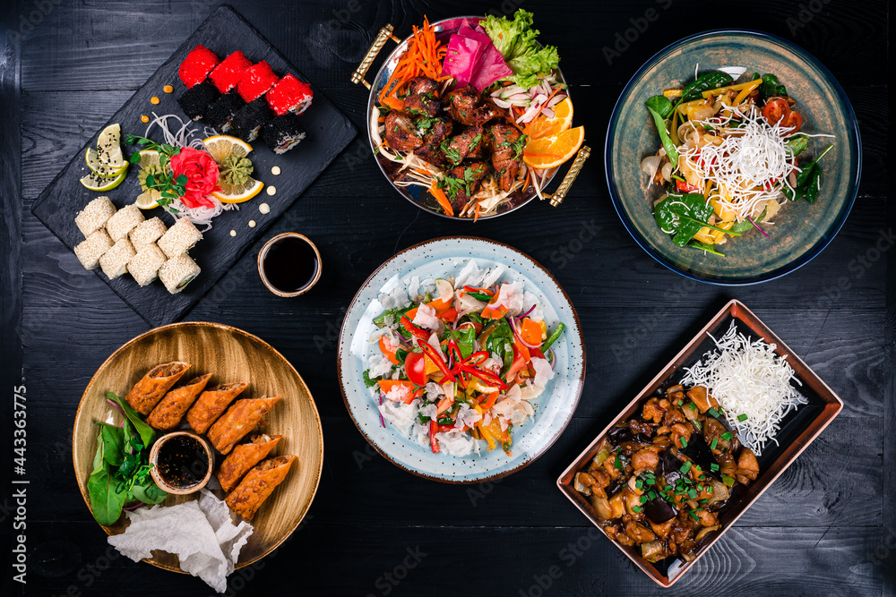 Asian food cooking. Wok, noodles and vegetables salad and chopsticks on dark rustic background