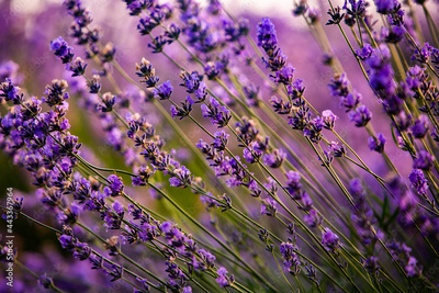 Beautiful lavender field at sunrise. Purple flower background. Blossom violet aromatic plants.