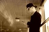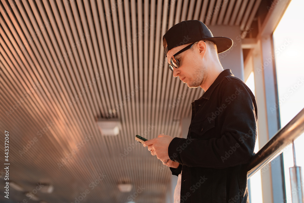 young fashionable modern guy, a man in a black cap and sunglasses with a smartphone, talks on the phone on a city urban background in a tunnel in the sunset rays of the sun.