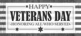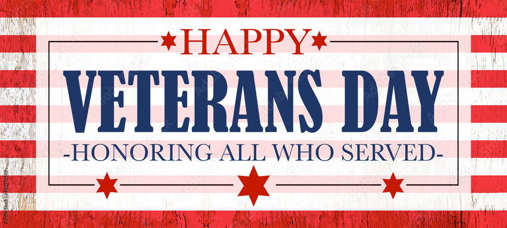 Happy Veterans Day background banner greeting card background banner panorama template - American flag and lettering, isolated on rustic wood texture, wooden table, top view