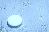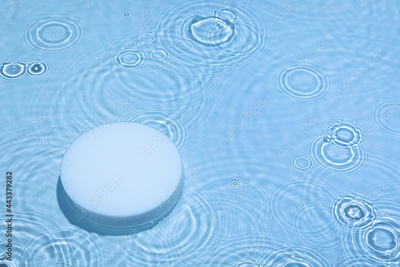 Empty white circle podium on transparent clear calm blue water texture with splashes and waves in sunlight. Abstract nature background for product presentation. Flat lay cosmetic mockup, copy space.