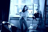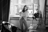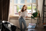 Young beautiful brunette woman drinking morning coffee while standing by the window in the apartment near table with laptop
