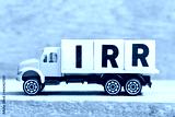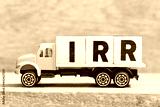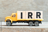 Toy truck hold alphabet letter block in word IRR (Abbreviation of internal rate of return) on wood background