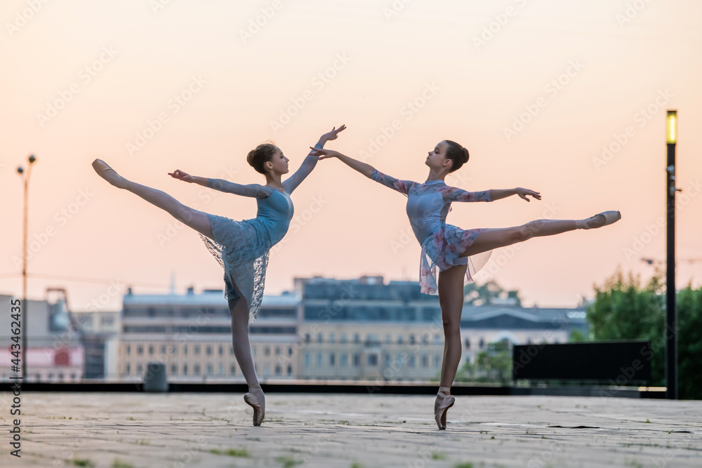 Two young ballerinas dancing in pointe shoes in city against the backdrop of sunset sky