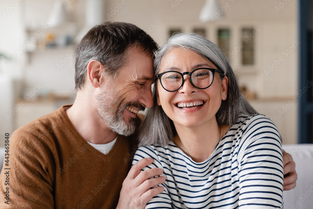 Happy mature middle-aged couple parents husband and wife embracing hugging together relaxing on a couch sofa at home. Close up portrait of a family moments, love and care