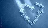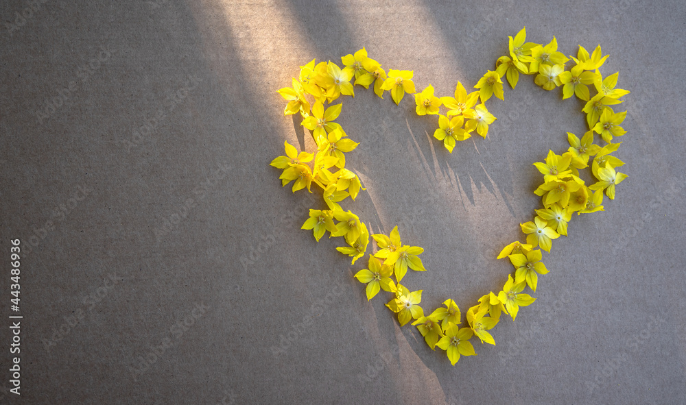 A heart made of yellow petals from a flower on craft paper, a greeting card template, a place for a photo.