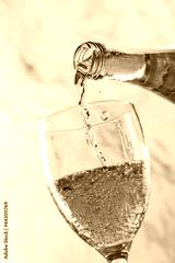 Green carbonated sweet water is poured into glass on light background. Glass bottle, splash, beverages, macro, close up, selective focus