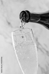 Cold champagne is poured into wineglass on light background. Champagne bottle, splash, alcohol celebration beverages, macro, close up, selective focus